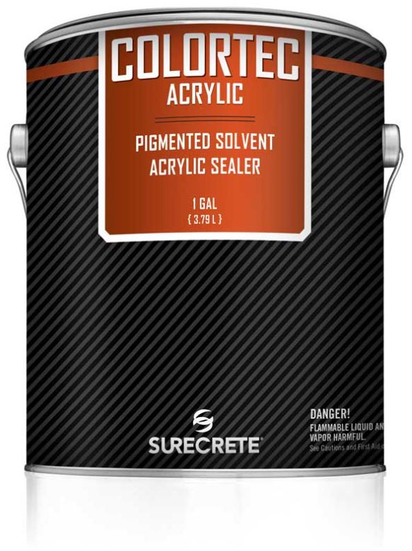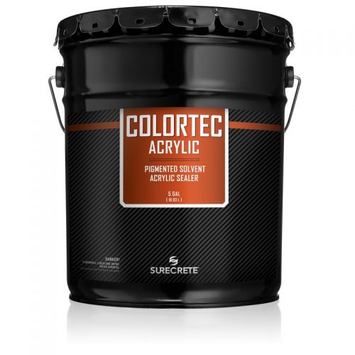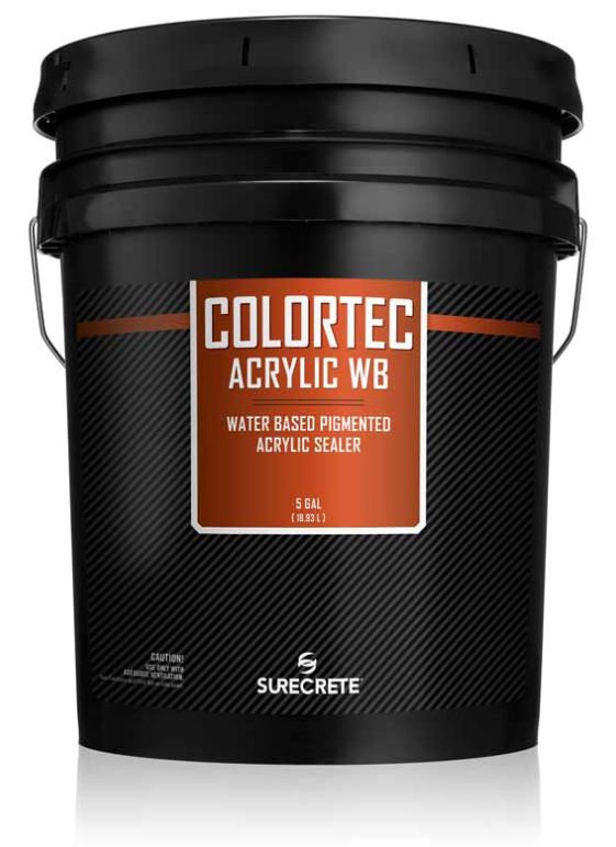 ColorTec AcrylicWB™ is a colored water-based outdoor concrete paint and sealer. Acrylic 30% solids, low VOC (less than 100 grams per Liter), strong binding, color, satin acrylic sealer for overlays or any cement based product. Our water base colored concrete sealer contains a hybrid, self-cross-linking, acrylic resin with built-in water repellents and tenacious penetration and adhesion. It contains no wax or silicone additives. Pigments are specifically formulated for UV stability, will not blush, and retain long gloss retention. Pigmented WB is non-flammable and environmentally safe.