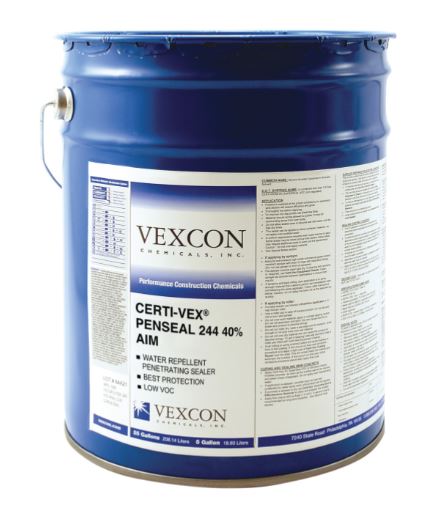 CERTI-VEX PENSEAL 244 40% AIM is a high performance, 40% solids, surface applied, low-VOC, solvent-based, clear penetrating water repellent silane sealer for concrete. When properly applied the treatment does not produce a surface build up, darkening or other effect on the color or texture of the surface leaving a natural appearance. The material’s small molecular structure allows for maximum penetration into new concrete (14 day minimum) or existing concrete surfaces.