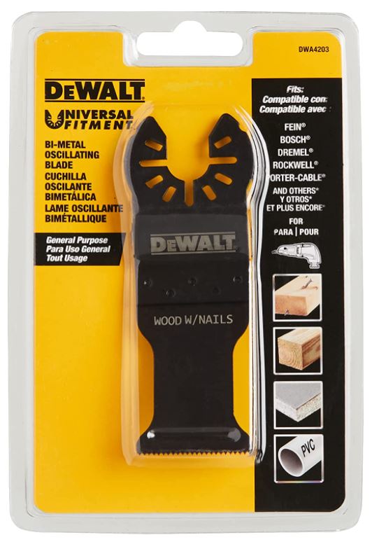 The DEWALT DWA4203 Oscillating Wood with Nails Blade is designed with UNIVERSAL FITMENT for use on all major brands of oscillating tools (no adapter required). This blade is ideal for cutting wood with nails.