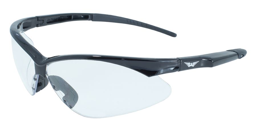 Contender Black safety glasses with clear shatterproof polycarbonate lenses that Meet ANSI Osha standards. Glasses have scratch resistant coating.