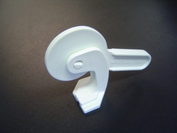 This Camlock Clamp from Plastiform attaches to the back of the Plastiform form board. This clamp attaches with a twist and then slides up and down the board to the desired location. They are then clamped to 3/4-inch round-pin stakes to set the form board's desired height.
