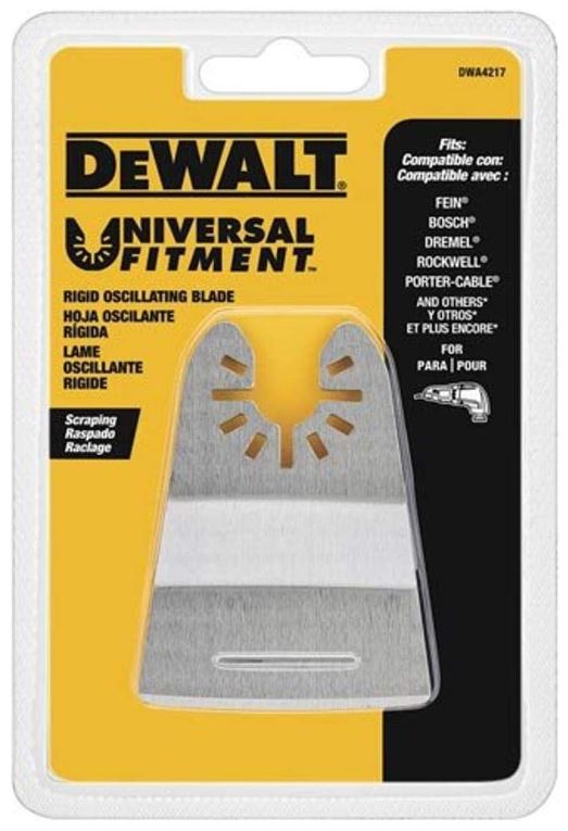 The DEWALT DWA4217 Oscillating Rigid Scraper Blade is designed with UNIVERSAL FITMENT for use on all major brands of oscillating tools (no adapter required). This blade is ideal for scraping applications.