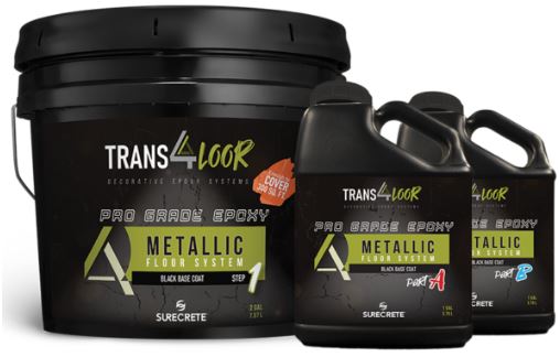 TRANS4LOOR METALLIC DECORATIVE EPOXY SYSTEM is a two-component, solvent free, 100% solids epoxy/amine system designed specifically for applications over concrete floors and countertops where maximum durability and chemical resistance are required within a decorative metallic system. The high gloss material is available in a solid color base coat, and a clear formula where metallic pigments* are added.